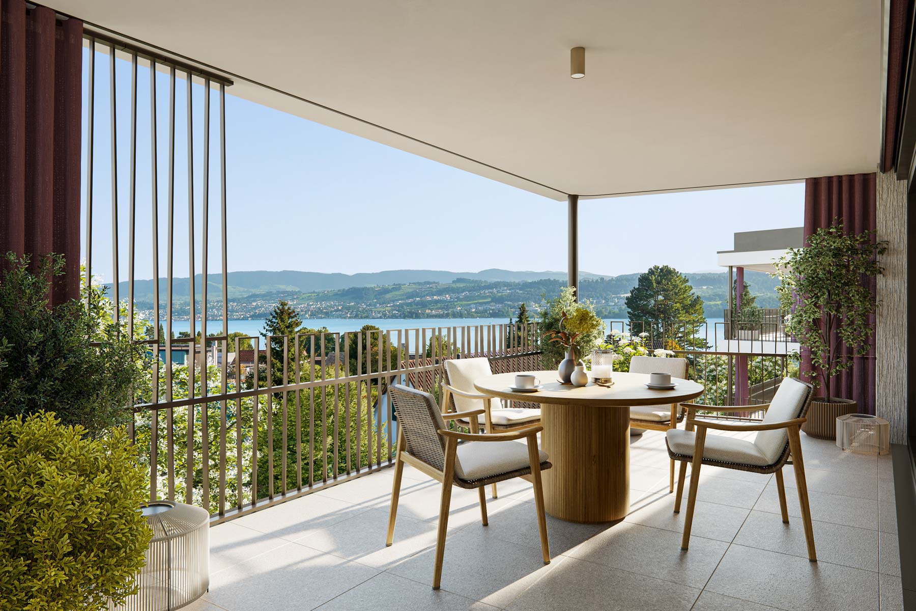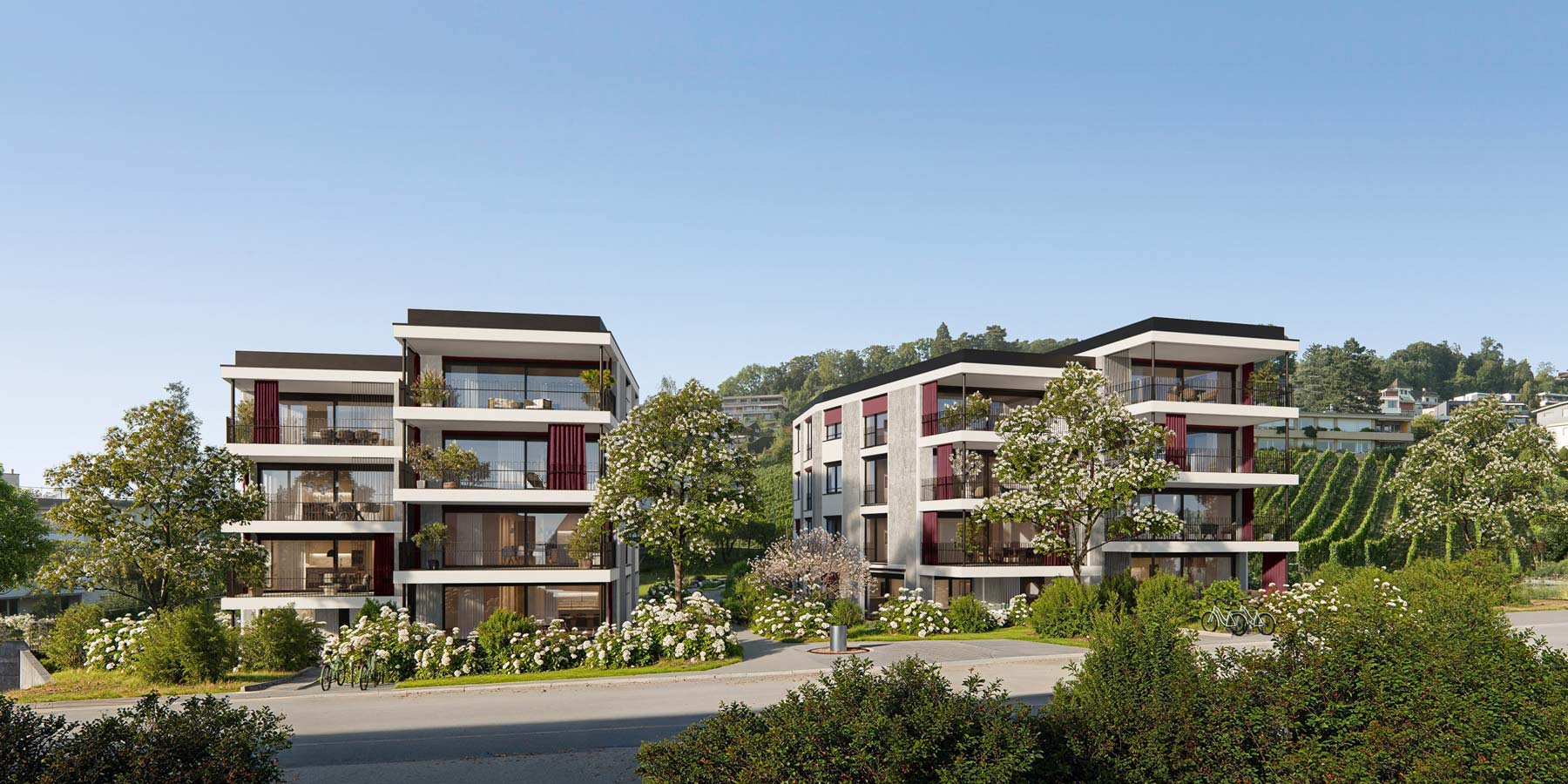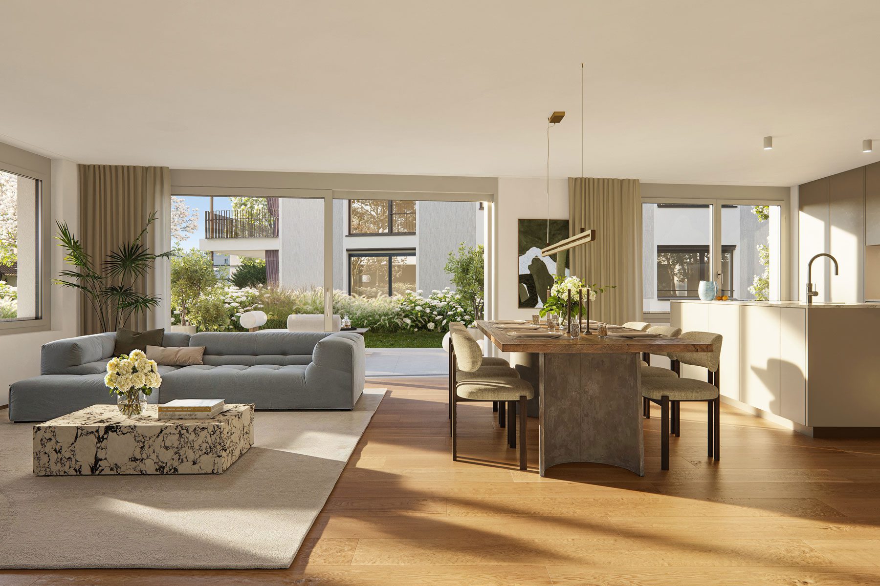 Sonnige Balkone von über 20m² oder vier liebevoll gestaltete Privatgärten von bis zu 200m² Grösse erweitern den Wohnraum nach draussen.