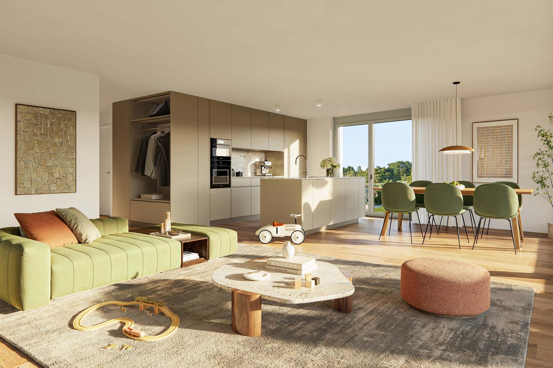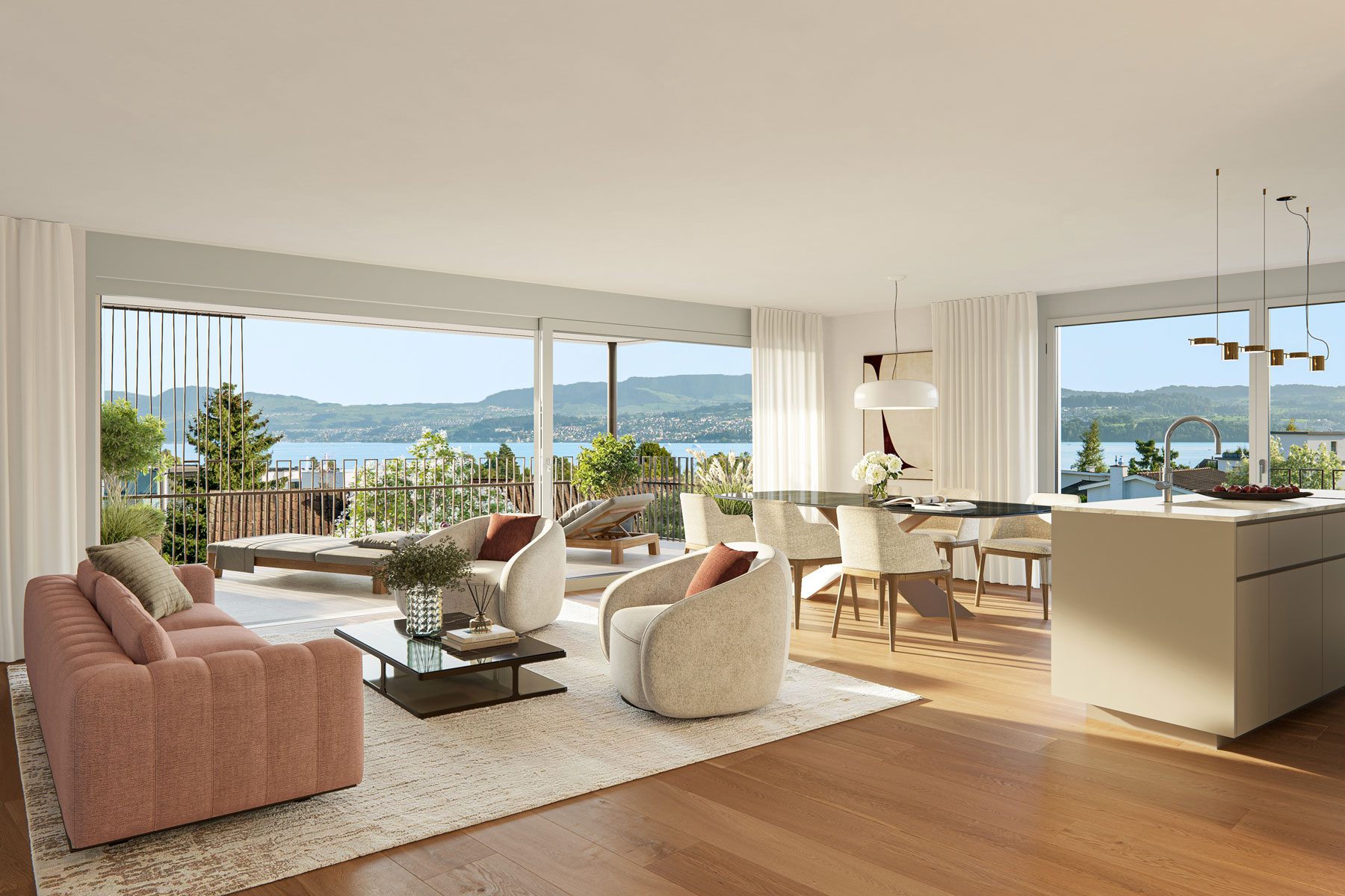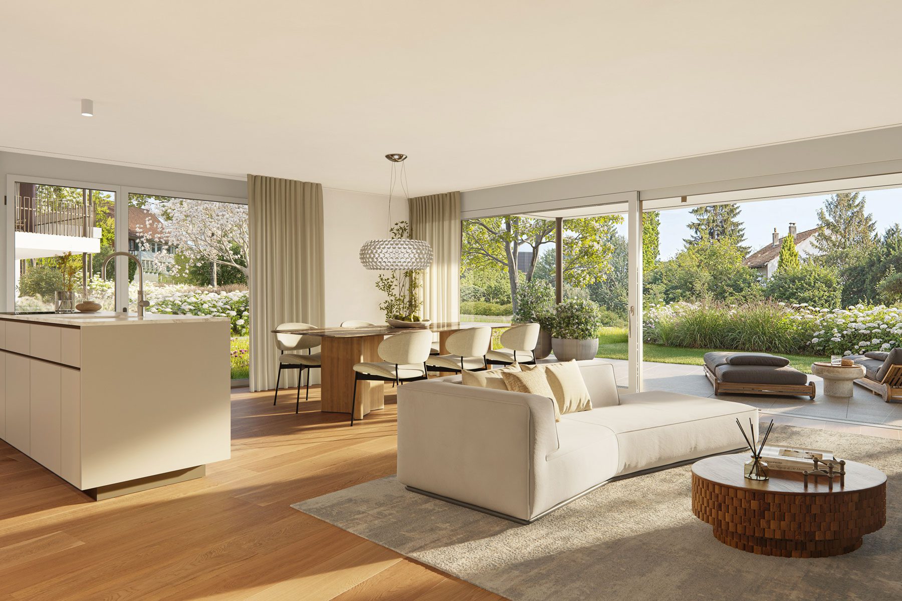 Sonnige Balkone von über 20m² oder vier liebevoll gestaltete Privatgärten von bis zu 200m² Grösse erweitern den Wohnraum nach draussen.