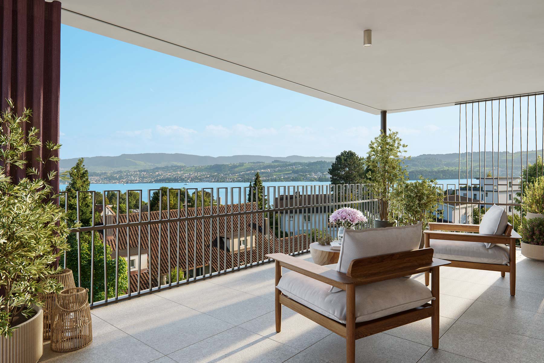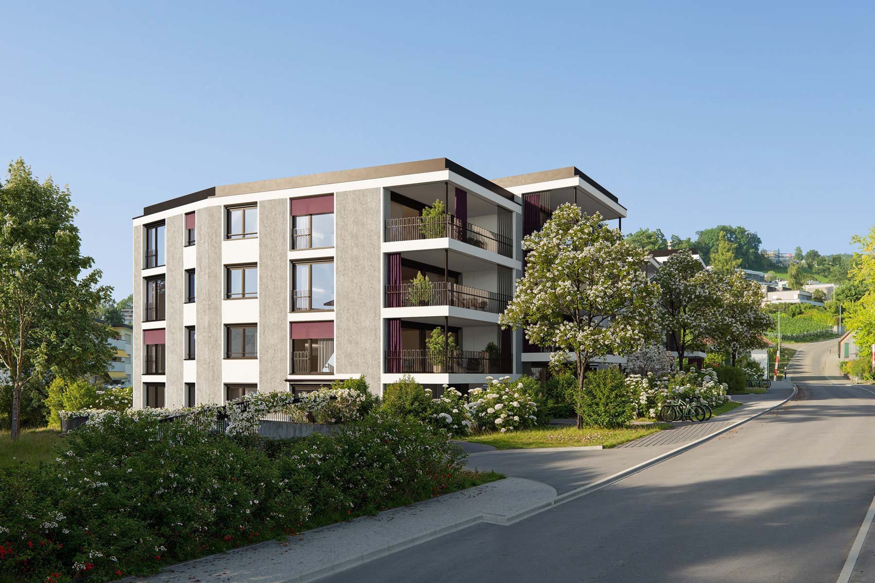 Die Wohnungen in den Obergeschossen verfügen über einen direkten Liftzugang in die Wohnung. In den obersten Etagen öffnen sich beeindruckende Ausblicke über die Umgebung, in die Rebberge und teilweise auf den Zürichsee.